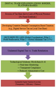 Taxation Challenges: Trade in the digital era challenges fixed establishment ideas. In the digital business, significant income is earned without having a physical presence in the jurisdiction, leading to an erosion of the tax base. Developing countries are pushing for consumption taxation because the profits are earned from consumers that are active in their markets.OECD’s BEPS Pillars are a guiding light, yet implementation is diverse[6,7]. On the one hand, unilateral digital taxation may contribute to close revenue gaps and, on the other, to trade retaliation. It would be very difficult for people to do real-time monitoring and at the same time keep the situation very transparent, if it were not for technological developments such as blockchain and AI. These can enable transparent taxation while coexisting in harmony with the minimal compliance cost requirement.
