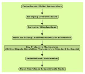 Consumer-Protection Imperatives: Consumers are the most disadvantaged in cross-border digital transactions. Among the threats are fraudulent platforms, misrepresentation, and algorithmic exploitation. A strong consumer-protection system is the best weapon to regain lost trust and at the same time it acts as an incentive[17,18]. Participants would be happy if for instance, they find an online method of conflict resolution, mechanisms of transparency, and standard contracts, all being in place. They would also feel secure since these activities are coordinated at an international level by the relevant authorities of the involved countries and, thus, enforcement and dispute resolution are efficient worldwide.